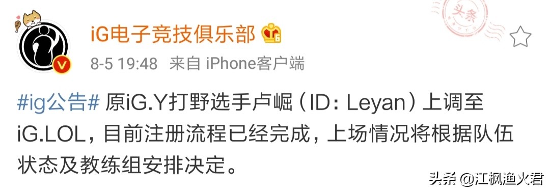 最近,各个赛区的夏季赛都进入到了收尾阶段,很多的队伍都进行抢分为了最后季后赛的名额而冲刺,我们lpl赛区不例外,自从ig战队败给了blg战队以后,我们赛区的后面几个队伍基本上就已经乱了,所有的队伍都有了自己的希望,只要能够稳住局势,就有机会进入到今年的季后赛,而IG战队形势并不乐观,依照他们目前的状态上来看很有可能会和季后赛无缘,而最近,他们也是官方宣布了人员的变动。