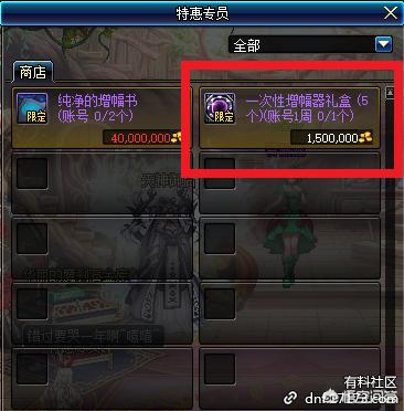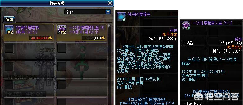 谢邀,本次DNF更新的“特惠专员商店”里面出现了两个道具,一个是价值四千万金币的“纯净的增幅书”,另一个是价值一百五十万金币的“增幅器礼盒(5次)”,那么这次的活动究竟是福利还是坑呢?接下来我就跟大家一起分析一波!