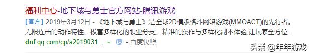 首先大家打开网页,然后用百度搜索引擎搜索关键字“DNF福利中心”,搜出结果后,大家找到带有“官网-福利中心-地下城与勇士官方网站-腾讯游戏”字样的前排搜索结果,记住这个结果的下面显示的域名一定要是“dnf.qq.com”,然后点击进入即可,这样不会被盗号。