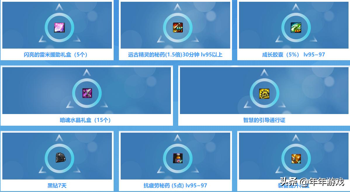 首先是登录奖励,开服当天登录可以拿到一张95-97级的升级券,这可香得不行,大家都想快速满级,这真的是雪中送炭啊!其他两个登录奖励则是新深渊通行证和材料,这些就不说了。