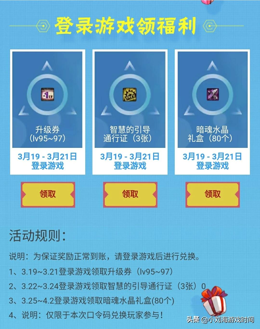 然后第二部分,也就是我们这里要说的重点内容,【登录即可领取】(还是需要输入一次口令码),可以看到福利总共有3种,分别是升级券、深渊门票、以及暗魂水晶(升级工作服的材料)。