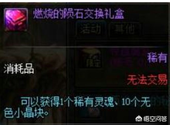 ⑤9个燃烧的陨石兑换一个燃烧的陨石交换礼盒,打开后获得1个稀有灵魂和10个无色小晶块。