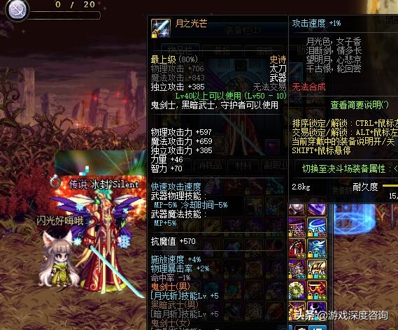 本人虽没有用月之光芒刷过太多副本,但月之光芒这把太刀外形确实很不错,又细又长,剑身发着青色,同时,月之光芒附加的话也很有意思(月光色,女子香,泪断剑,情夺长,忘明月,心悲凉,千古恨,轮回尝),值得我们幻化一下。