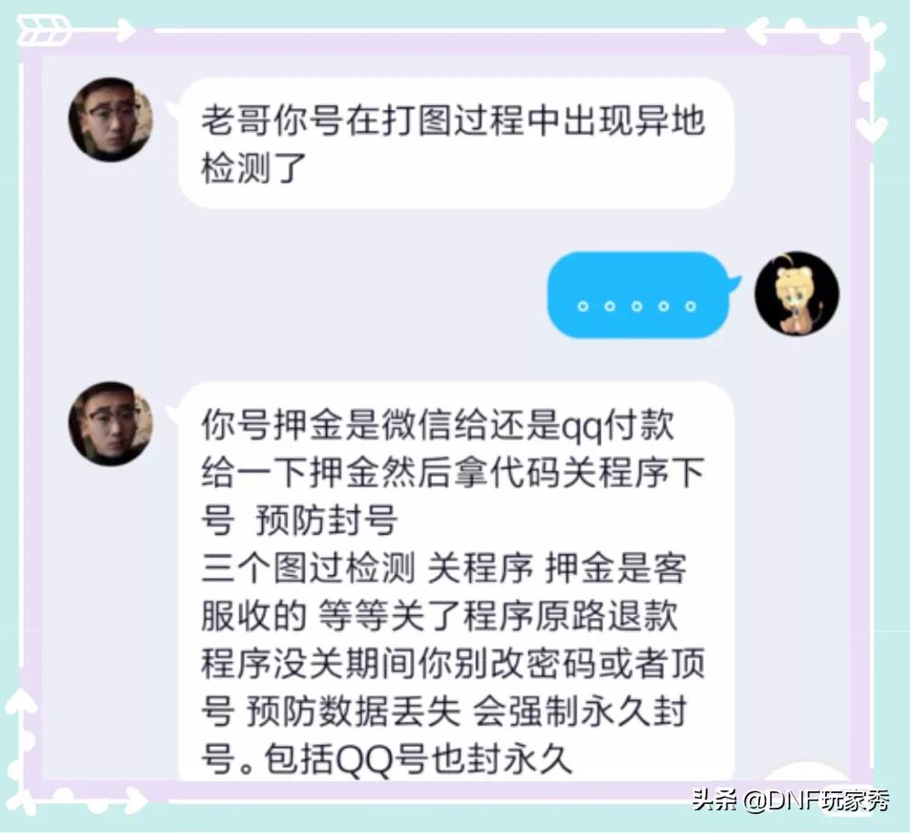 对方告知玩家,“你的号在打图过程中出现异地检测了,你把押金支付了,然后拿代码关程序下号,预防被封号!”并且一再强调,“押金是客服收的,关了程序后会退款,不然账号永封,QQ也会被封”!