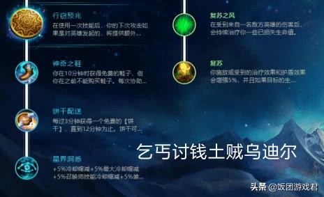 乌迪尔的技能cd特别特别短,除此之外,e技能还可以将敌人击晕,W又可以回血,提高自己续航力,Q技能持续输出,在这样的技能搭配下,乌迪尔拥有了走上单的可能性。除了必须点出的行窃预兆之外,我们的符文选择可以是神奇之鞋加饼干加星界洞悉,副系符文点出坚决的复苏之风和复苏,饼干和坚决符文是为了提高乌迪尔在线上的续航力。