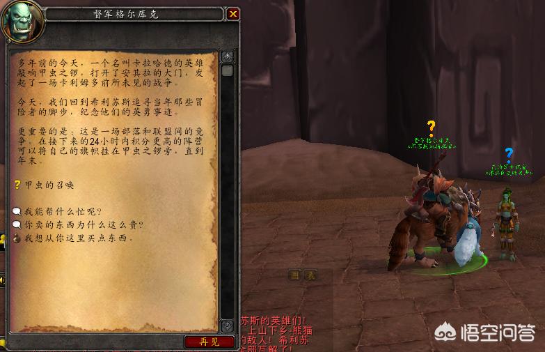 现在想获取这个7天的甲虫坐骑,其实很简单。前往希利苏斯左下角的“安其拉废墟”或者右上角的时光NPC,只要回到过去在没有萨总大宝剑的希利苏斯,就可以接到“甲虫的召唤”这个任务。依然是带有简化版的收集物资任务,但并不敲锣,获胜的阵营只是在铜锣的两边挂阵营旗帜。
