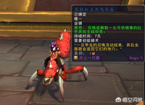 这个“其拉红玉共鸣水晶”是直接放在包裹里的,只有7天期限的召唤坐骑道具。点击就可以召唤出一个其拉主战坦克的甲虫坐骑,颜色分阵营,部落是“红色其拉主战坦克”,联盟是“蓝色其拉主战坦克”,可在安其拉神殿之外的地图骑行,但不可以飞行和水上行走。