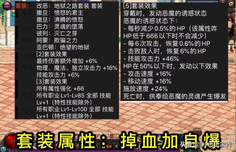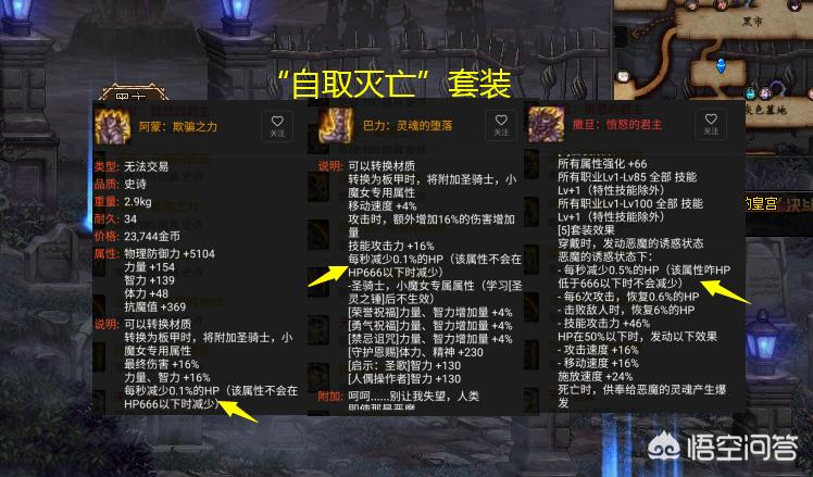 这个套装的属性特点像姨妈项链一样会掉线,可不像姨妈项链每秒会掉20点的血,而是0.1%的血,当然会掉线的装备可不止一件,只要有关于“自取灭亡”的装备都会掉血,而像神话装备撒旦·愤怒的君主掉血的速度更为礼盒每秒掉落0.5%,不过你可不用担心他会掉线掉死,在666血量的时候血量将不会减少,不过被小怪打死的几率却很高。