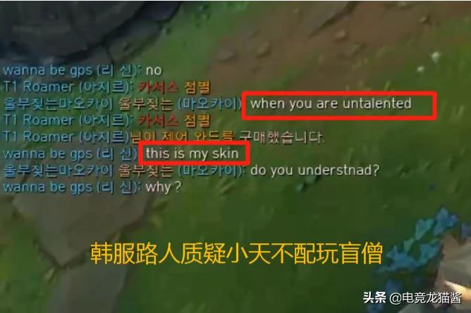 由于LPL进入了休赛期的缘故,FPX战队打野Tian也加入了“直播大军”,并且时常会去韩服进行排位上分,但在一场排位赛中,Tian却与韩服路人发生了一件令人不悦的事,当时是这位韩服路人选了上单大树,经查询,此人为“百年老树”,然后Tian选了盲僧进行打野,并且选用了他自己的冠军皮肤。本来两人也不认识,没啥渊源,但这个路人却说了句:“如果你没天赋,就不要玩盲僧这个英雄!”,简直是在明示小天不配玩盲僧。