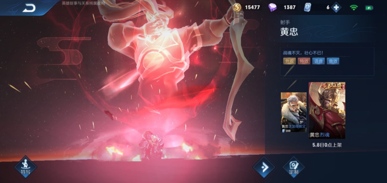 今天的游戏更新直接上架了黄忠的裂魂,这是一款五虎将限定皮肤,5月5号已经上架赵云的龙胆,不到四天时间就上架了黄忠的裂魂,想必接下来应该每几天就会上架一款5虎上将的限定皮肤了,大家准备好钱包拭目以待吧!