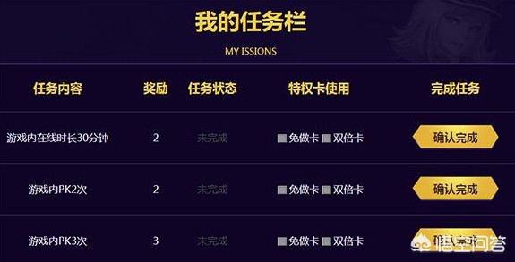 首先你得到心悦,每天会有三个任务,比如说站街多少分钟,消耗多少疲劳值。完成任务获得成就点可以兑换光环宠物,通过首页抽奖会获得双倍卡或者免做卡,现在可以组队完成,建议组队每周可以多给20点