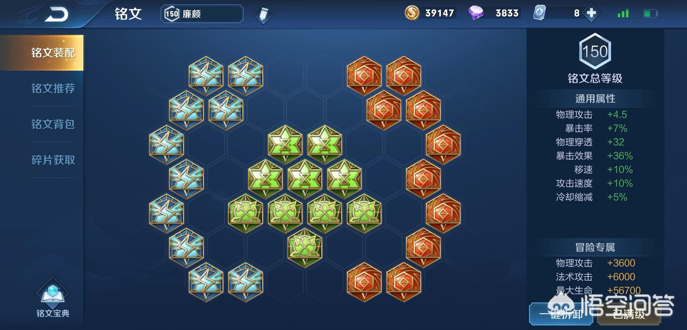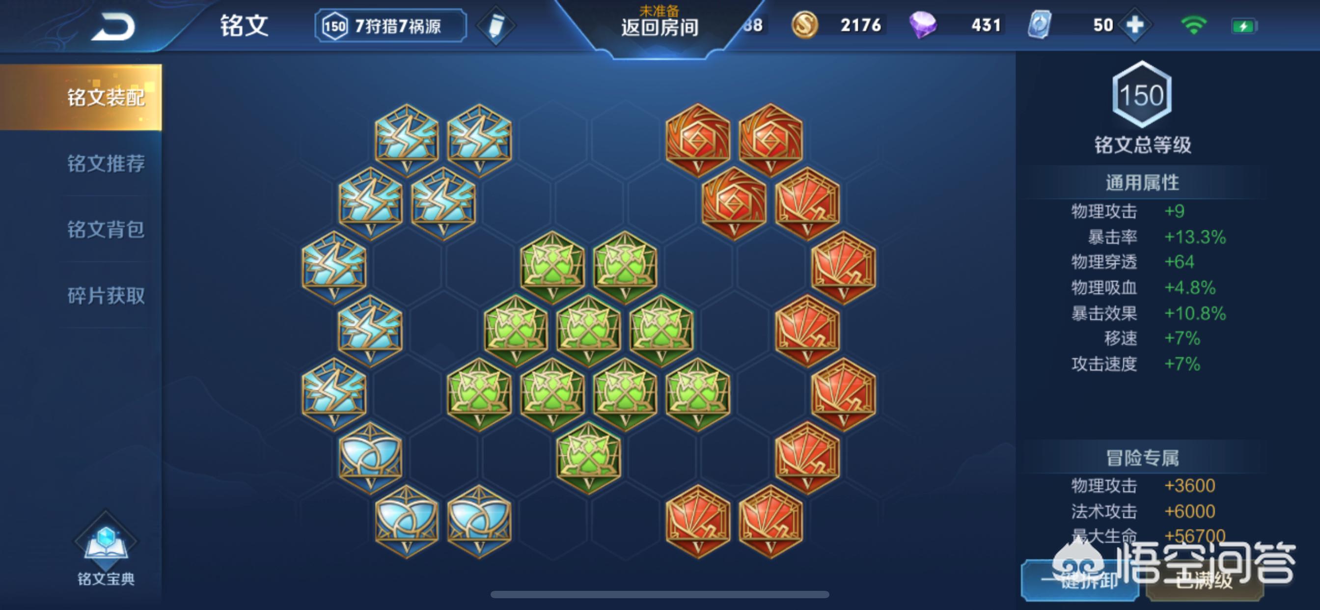 首先蓝色铭文有两种选择,抗压的话选调和,凶一点选狩猎;绿色选择鹰眼配怜悯,5个怜悯是配合极寒风暴和暗影战斧让铠冷却达到40%;最后红色铭文选择暴击流标配无双!