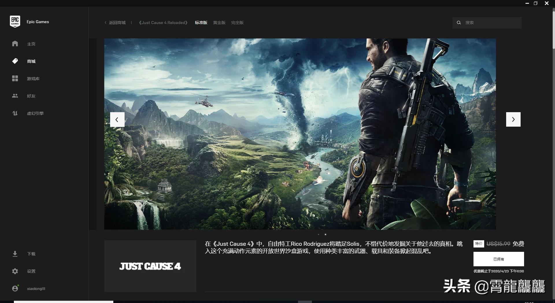 大家好,这里是霄龍,《正当防卫4》原版名称《Just Cause4》是由 Avalanche Studios 制作的第三人称射击游戏的正当防卫一代延续至今的第三人称开放世界射击游戏,这一代发售于2018年12月初,近日也在游戏平台epic上免费送。1游戏背景:以虚构的南美洲索利斯为世界背景,随着加入了很多极端天气等有意思的元素,带着玩家进入了一个有着特殊物理特性以及,难以置信的独特世界。2近期epic平台免费发放正当防卫4游戏本体,非常值得大家前去领取,游戏很不错非常推荐大家游玩,