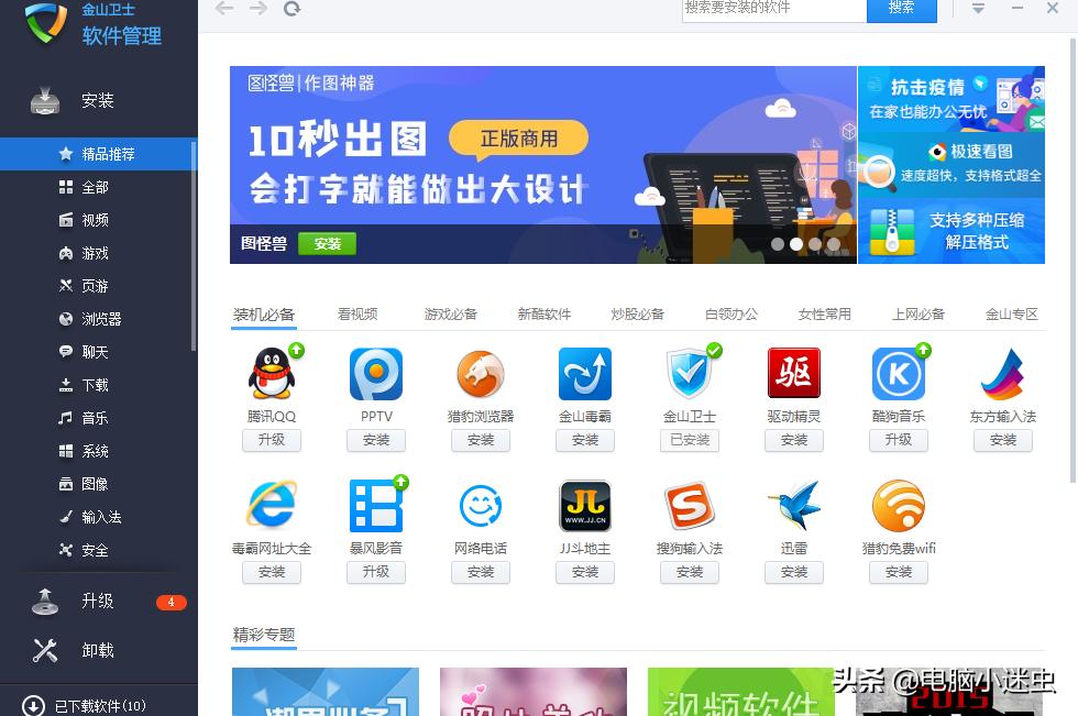 对于绝大多数人来说,平常需要使用的软件太多,一个个去官网下载太麻烦。可以选择使用第三方的软件管家,比如360软件管家,腾讯电脑管家等。这些管理一般收录了绝大多数主流的软件,一般搜索一下就能找到,并且可以一键下载并按照,省去了自己下载还要点击下一步的麻烦。当然从这些第三方软件管家下载软件也有一个缺点,就是容易捆绑安装,操作时注意取消那些捆绑安装的选项。