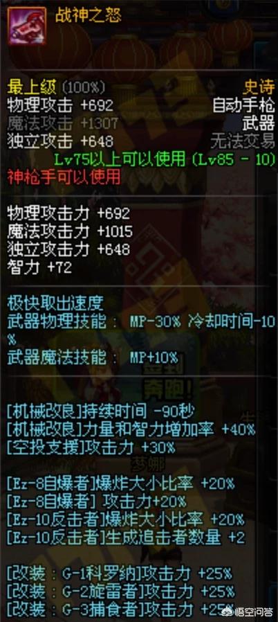 一款具备一套异界系列的武器战神之怒,属于女机械小毕业武器,不仅对机械改良技能的智力的增加率加成,而且同时对3G系列都有25%加成,这对主G系列的女机械来说属性加成非常强大。