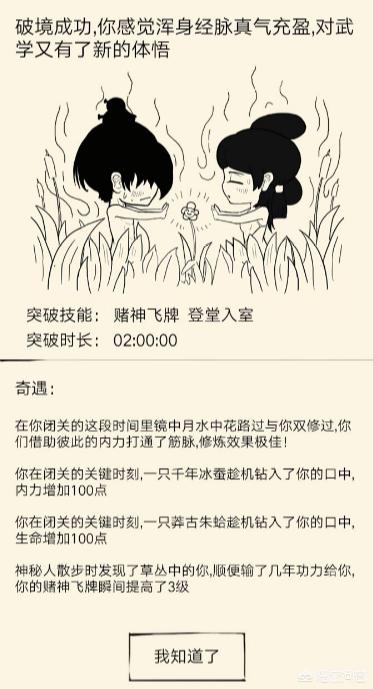 武侠题材的文字挂机游戏,剧情搞笑跳脱,手绘画风十分清奇,内容丰富以至于对新手玩家不太友好,极度依赖攻略。游戏类似一个沙盒世界,自由度很高,可以去拜师学武,参与事件,自我修炼(挂机),可以打NPC(打赢有装备),也可以刷NPC好感度(然后结婚生子)。如果不满意这个存档,可以拿麻绳上吊结束一生重头再来。类似的游戏还有《想不想修真》