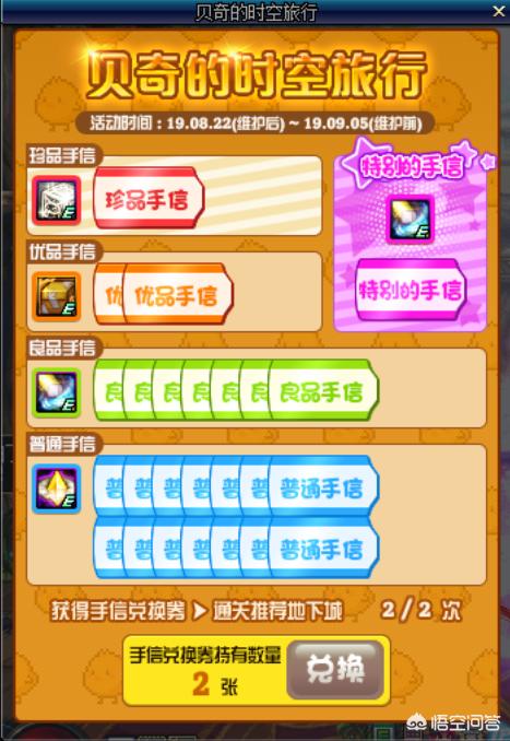 游戏中还有贝奇的时空旅行活动,完成之后可以获得各种材料,灵魂武器袖珍罐以及灿烂徽章礼盒,只需要每天通关推荐地下城即可获得兑换券,或者是可以直接用金币购买立马完成。