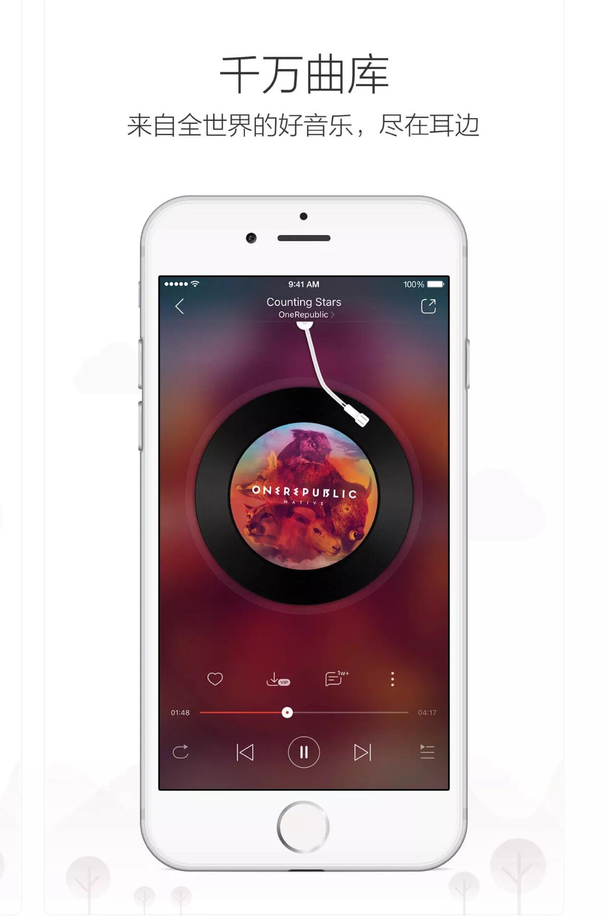 在苹果手机上,首屈一指的当属网易云音乐播放软件,不仅曲库最全,而且免费歌曲最多。网易云音乐的口号是“音乐的力量”,显示出网易云音乐的豪迈和霸气。有将近4亿用户的推荐,众说纷好,口碑极佳的音乐App,是下载了就舍不得卸载的音乐播放神器。