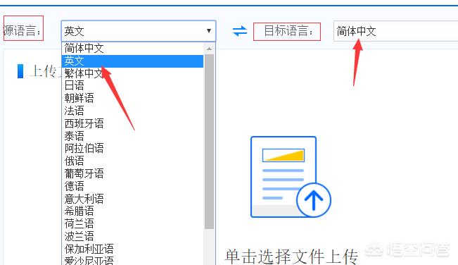 选择语言,源语言选择中文,目标语言选择英文,点击源语言和目标语言中间的交换按钮,即可交换翻译对象。