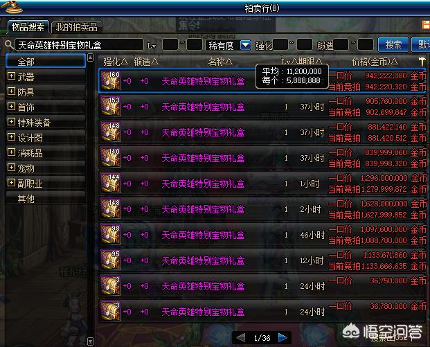 拍卖行有一个拍卖竞拍功能,黑商们会一次性低价大量上架一个道具,总金额大于人物的金币上限8亿,让玩家们只能看,不能买。如下图的宝物礼盒,礼盒的价值在1200万,但是,被黑商们利用竞拍功能,活生生的把价格压倒588万。