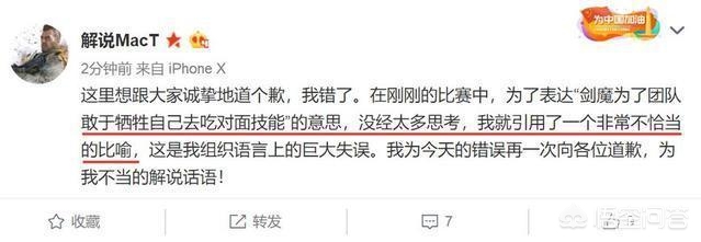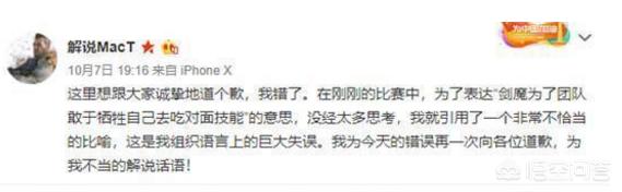 MacT在之后微博上也是承认错误,这种事可以理解,毕竟是解说,嘴中不停的哒哒哒,而且还有恰当的比喻,不过说话不过脑子也是容易毁一生。