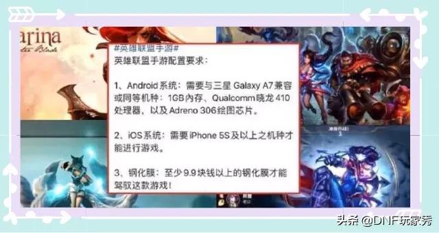 近日,英雄联盟手游官方给出了手机的最低配置要求,简单来说,安卓系统需要配备与三星Galaxy A7相容或同等以上机型,即搭载高通骁龙410处理器,配备1GB的运行内存,以及Adreno 306显卡;而iOS系统则需要苹果A7以上的处理器,也就是说只要iPhone 5S以上就能正常运行。配置要求如下所示