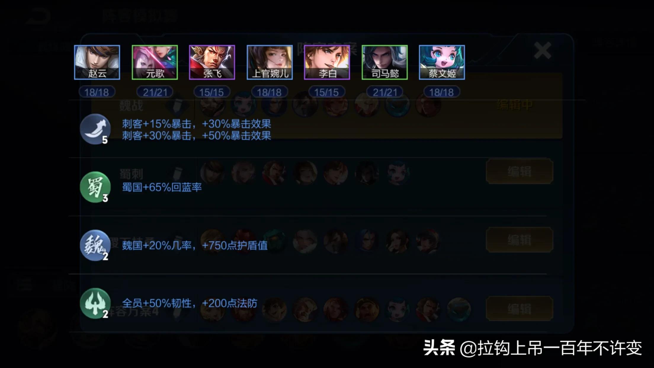 很好用的一个刺客阵容,没有短板,和那个精英战一样,只要质量不差,谁都能打。相对来说比较惧怕上面那个战士阵容。另外我这个发的算是一个变种,比较常规的是把司马蔡文姬换成百里兄弟+盾山。