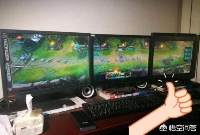 可以看到这位玩家是用三个屏幕来玩游戏,正常玩家玩游戏一般都是用一个屏幕的,一般视野就是中间那台电脑的视野,但是这位玩家利用三台电脑的操作是直接让视野扩大了三倍,直接从高地塔看到一塔那里了。