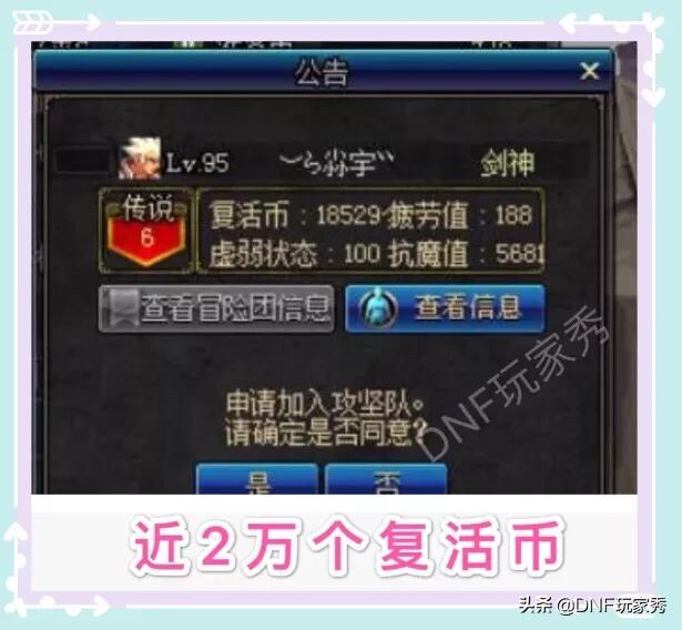(1)这位心悦3玩家,爱好开盒子,从他申请组队的复活币信息可以看出,18529个复活币,这得开多少个盒子啊,看到背包里不足1000个复活币,秀儿惭愧的低下了头;
