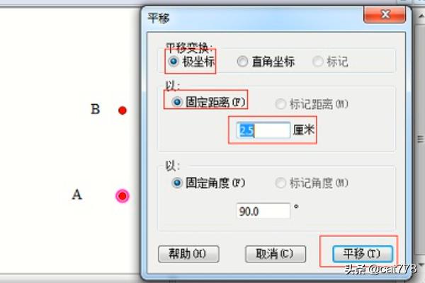 1. 使用平移命令构造点B。用点工具画一个点A,选中点击“变换”——“平移”。 平移窗口中在“固定距离”栏输入2.5后,点击对话框右下角的“平移”,即得到另一个点B。
