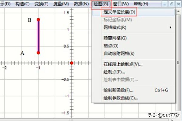 2、构造线段并定义单位长度。选中点A点B,点击“构造”菜单下的“线段”,就作出一条2.5厘米长的线段AB。在“绘图”菜单下选择“定义单位长度”,建立一个单位长度是2.5厘米的坐标系。